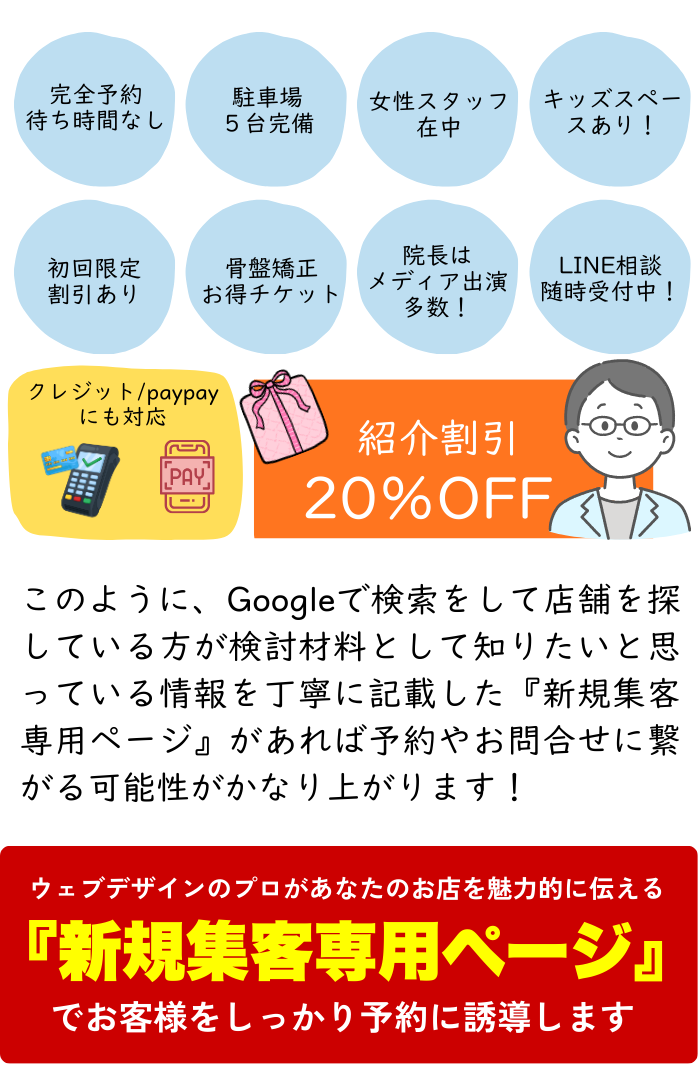 ※今回は“新規集客に特化した簡易ページ”のご提供となりますが、ご希望に応じて本格的なホームページ制作や、広告に効果的な症状に特化したLP制作のご相談も承っております。